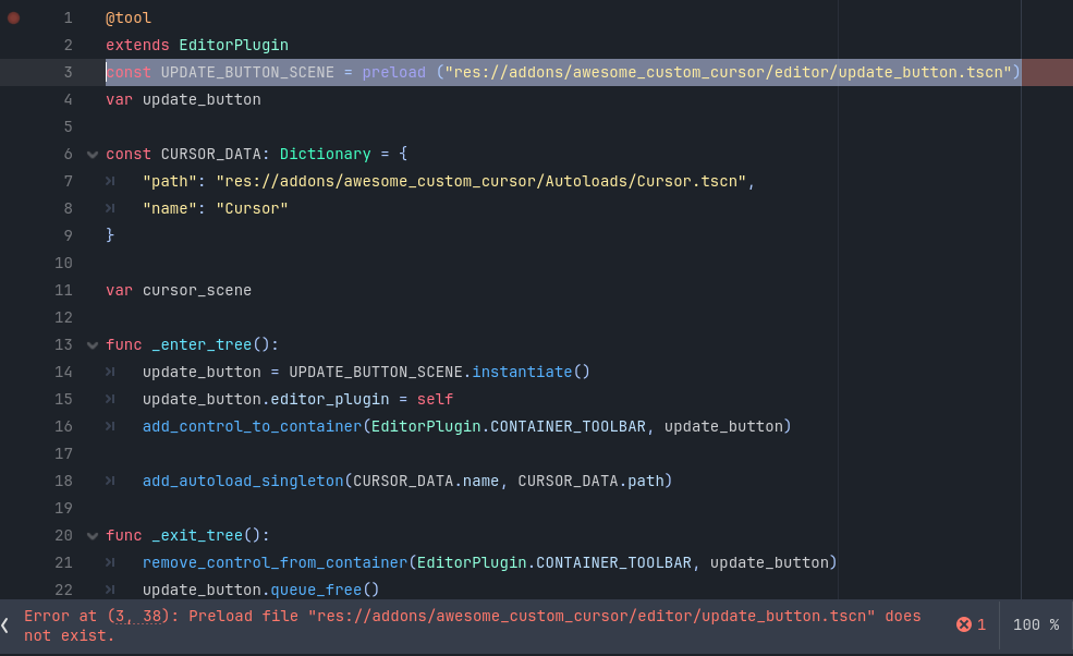 Just found a hiccup - the main script has a parse error because it's trying to preload a scene that's not included with this download, and the plugin doesn't seem to work without it. Screenshot for context, if it helps!